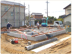 - 基礎が完成したら、その上に土台を据え付けていきます。上に立つ家を支える大切な部分です。